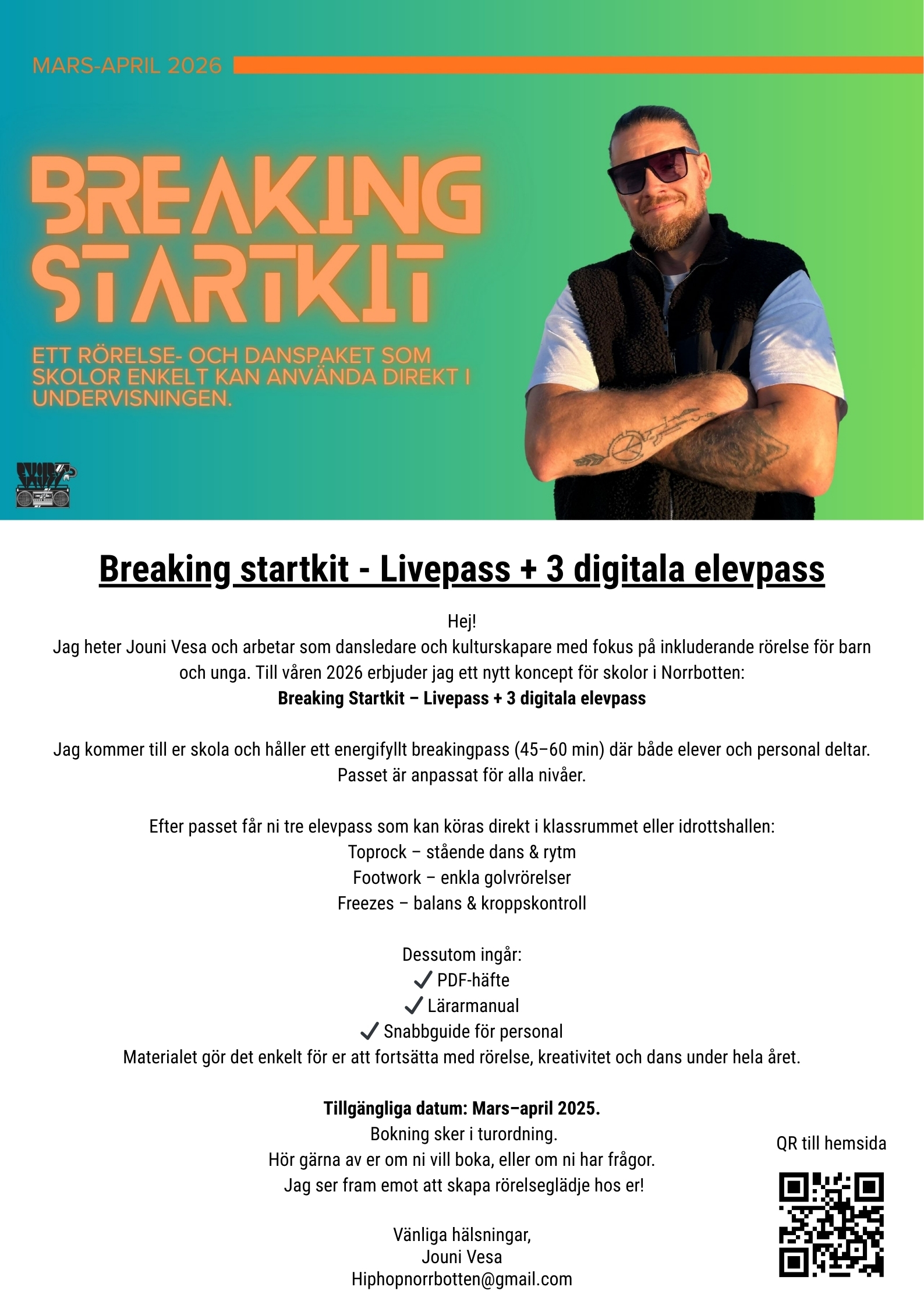 Jag heter Jouni Vesa och arbetar som danspedagog och kulturskapare med fokus på inkluderande rörelse för barn och unga. En av eldsjälarna från Exiled Dance Crew i Luleå. Till våren 2026 erbjuder jag ett nytt koncept för skolor i Norrbotten: